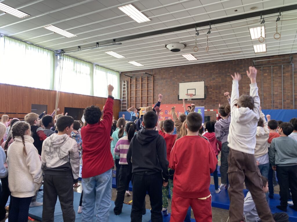 Am 20.02.2026 besuchte uns nach nun 2 Jahren wieder die Ridiculous Rhyme Show, deren Schauspielerin und Schauspieler es mit ihren englischen Reimen in einer interaktiven Darbietung und ihrem komödiantischen Schauspieltalent schafften, unsere Kids von der 1. bis 4. Klasse zum Mitachen und Lachen zu bringen.
