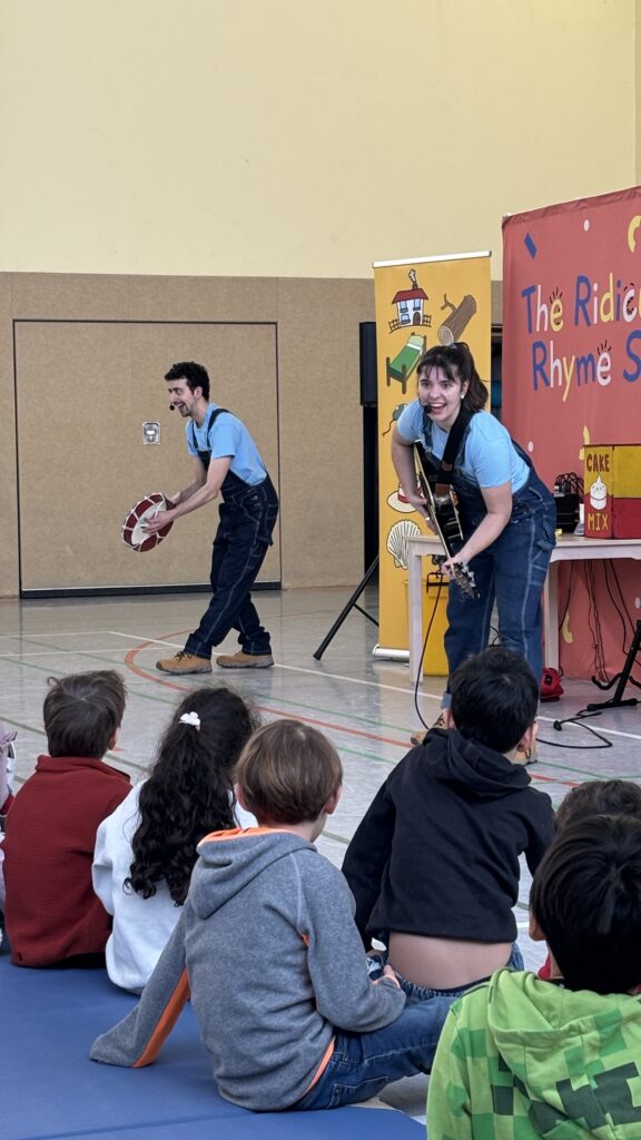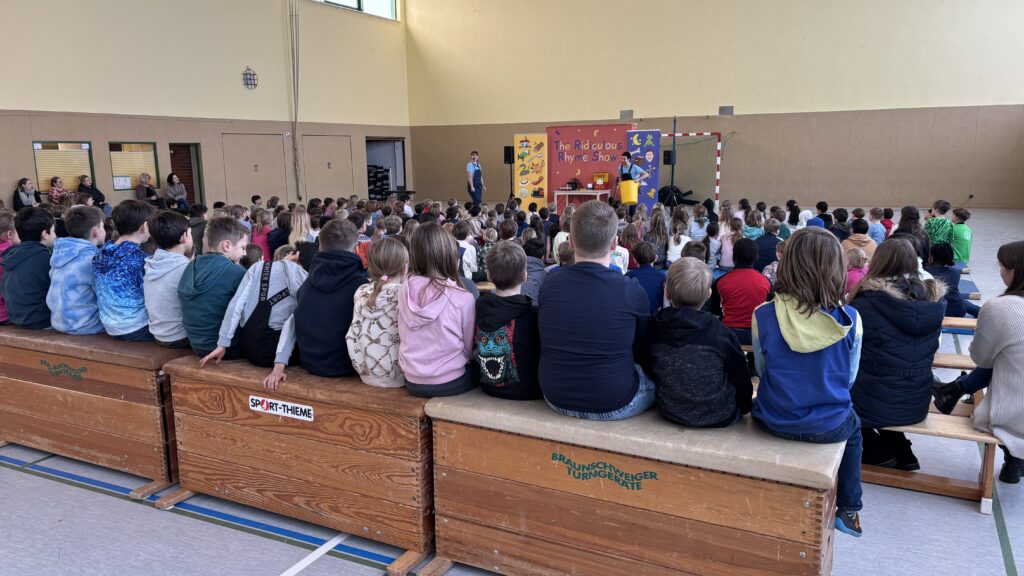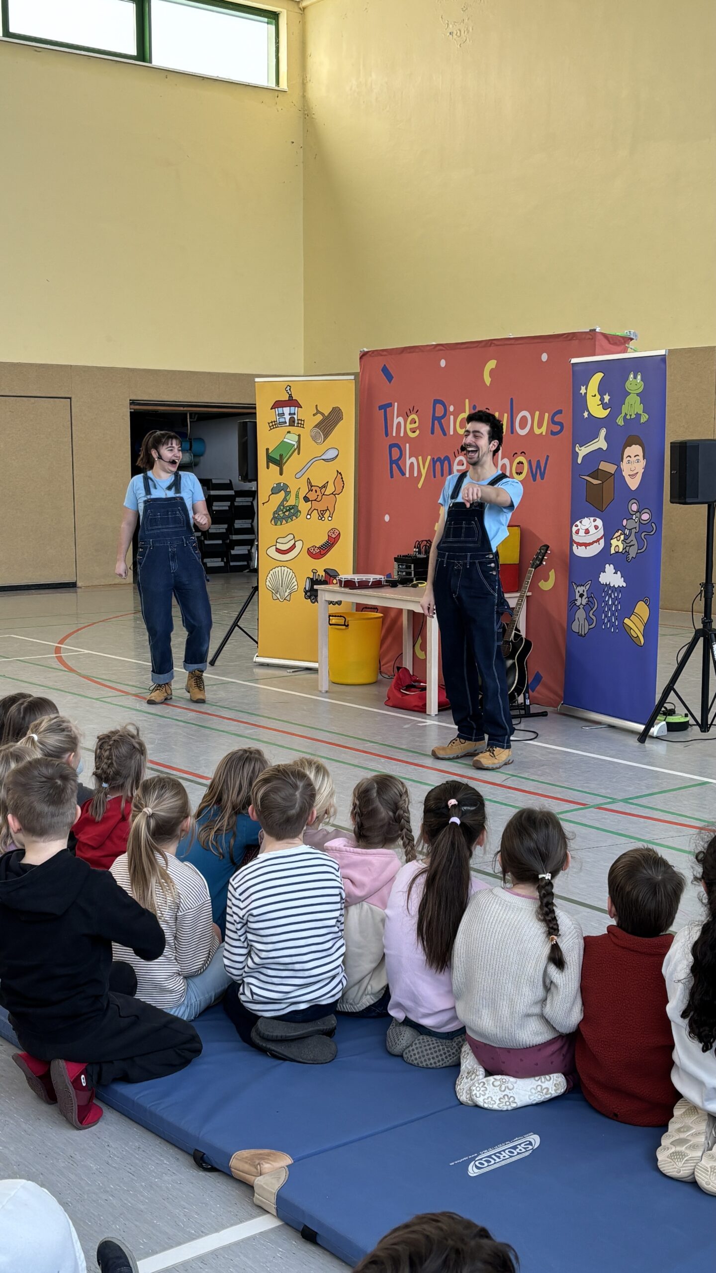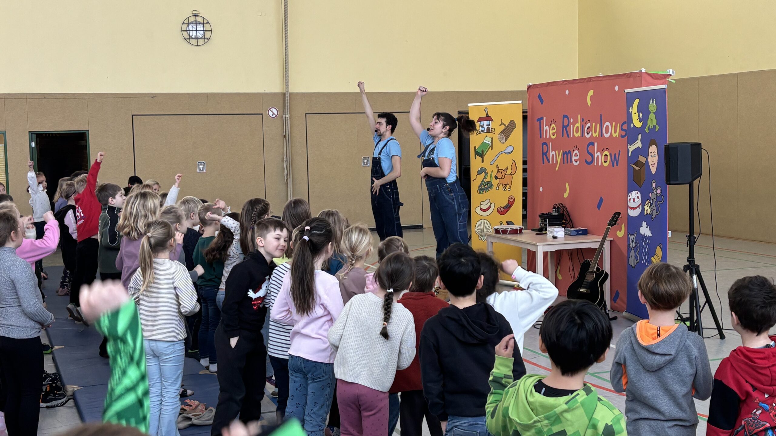 Am 20.02.2026 besuchte uns nach nun 2 Jahren wieder die Ridiculous Rhyme Show, deren Schauspielerin und Schauspieler es mit ihren englischen Reimen in einer interaktiven Darbietung und ihrem komödiantischen Schauspieltalent schafften, unsere Kids von der 1. bis 4. Klasse zum Mitachen und Lachen zu bringen.