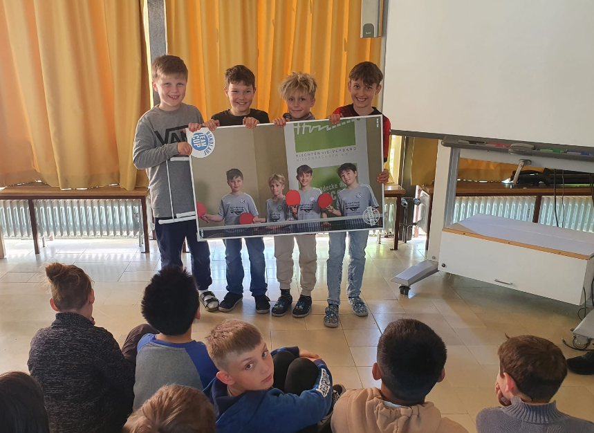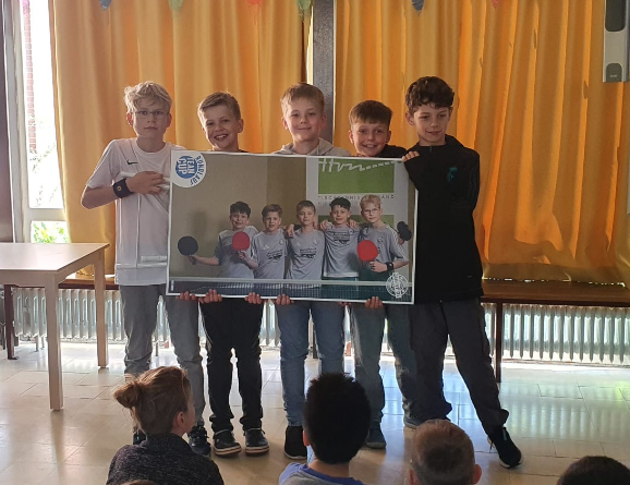 Am 6. Mai haben die Siegerteams des Tischtennis Rundlauf Cups in Ehmen ihre Preise überreicht bekommen. Bei den 4. Klassen gewannen die Kingbälle mit Leon, Mikkel, Jonte, Jesper und Joshua. Bei den 3. Klassen überzeugten The Flash mit Max, Milan, Matheo und Erik. Sie bekamen eine Tischtennisplatte mit ihrem Siegerfoto überreicht. Ein toller Preis des Niedersächsischen Tischtennisverbandes. Danke auch an Herrn Günter Donath vom TSV Ehmen für die Organisation.